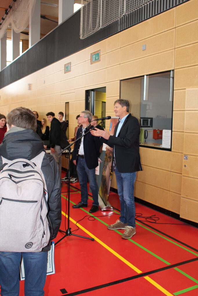 Beim Firmen-Speeddating 2026 versammelten sich knapp 50 Vertreterinnen und Vertreter aus den Bereichen Soziales, Wirtschaft und Technik in unsere Sporthalle. Ziel war es, unsere Schülerinnen und Schüler praxisnah auf zukünftige Bewerbungs- und Vorstellungsgespräche vorzubereiten, gegenseitige Kontakte zu knüpfen und über einzelne Berufsbilder zu informieren.