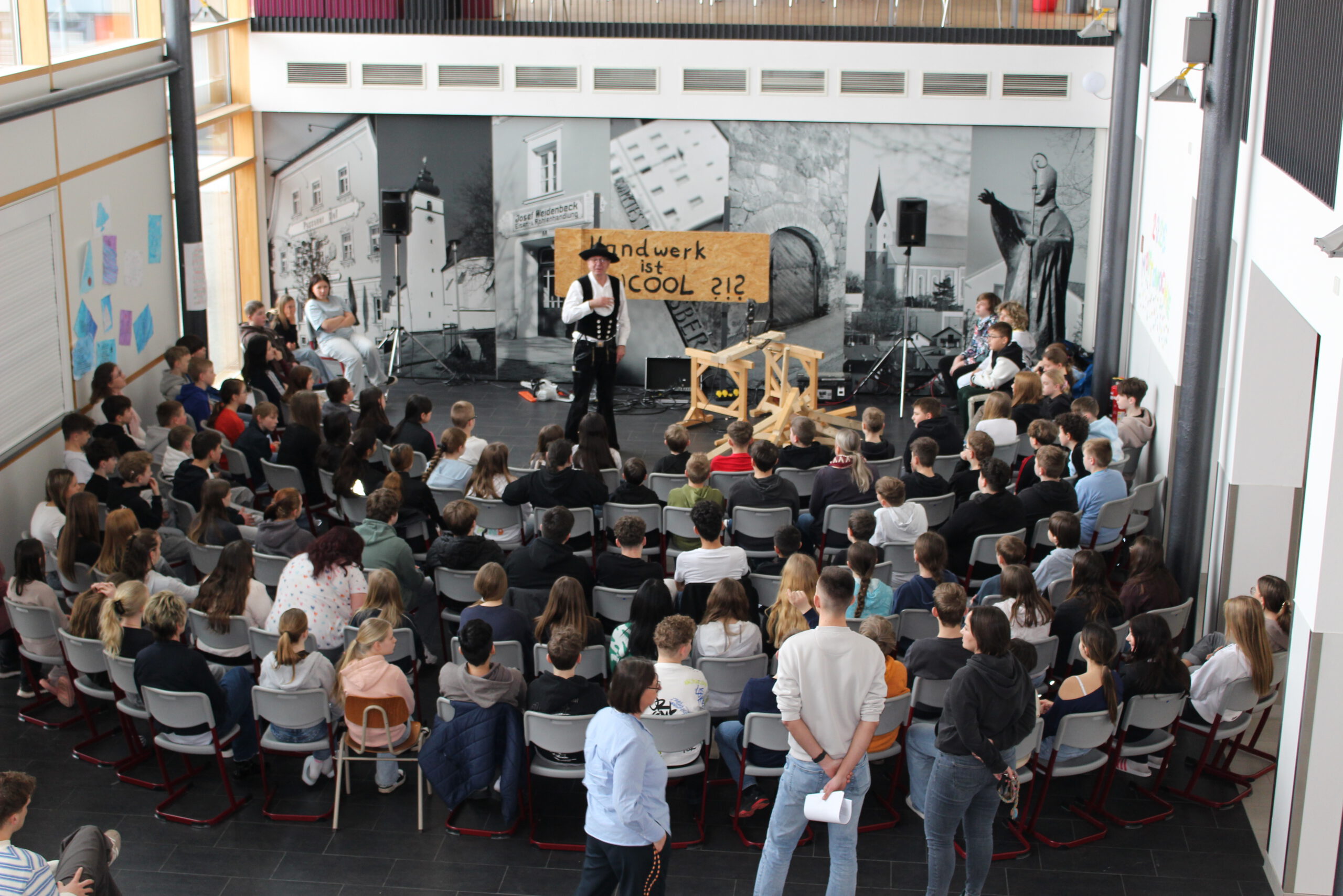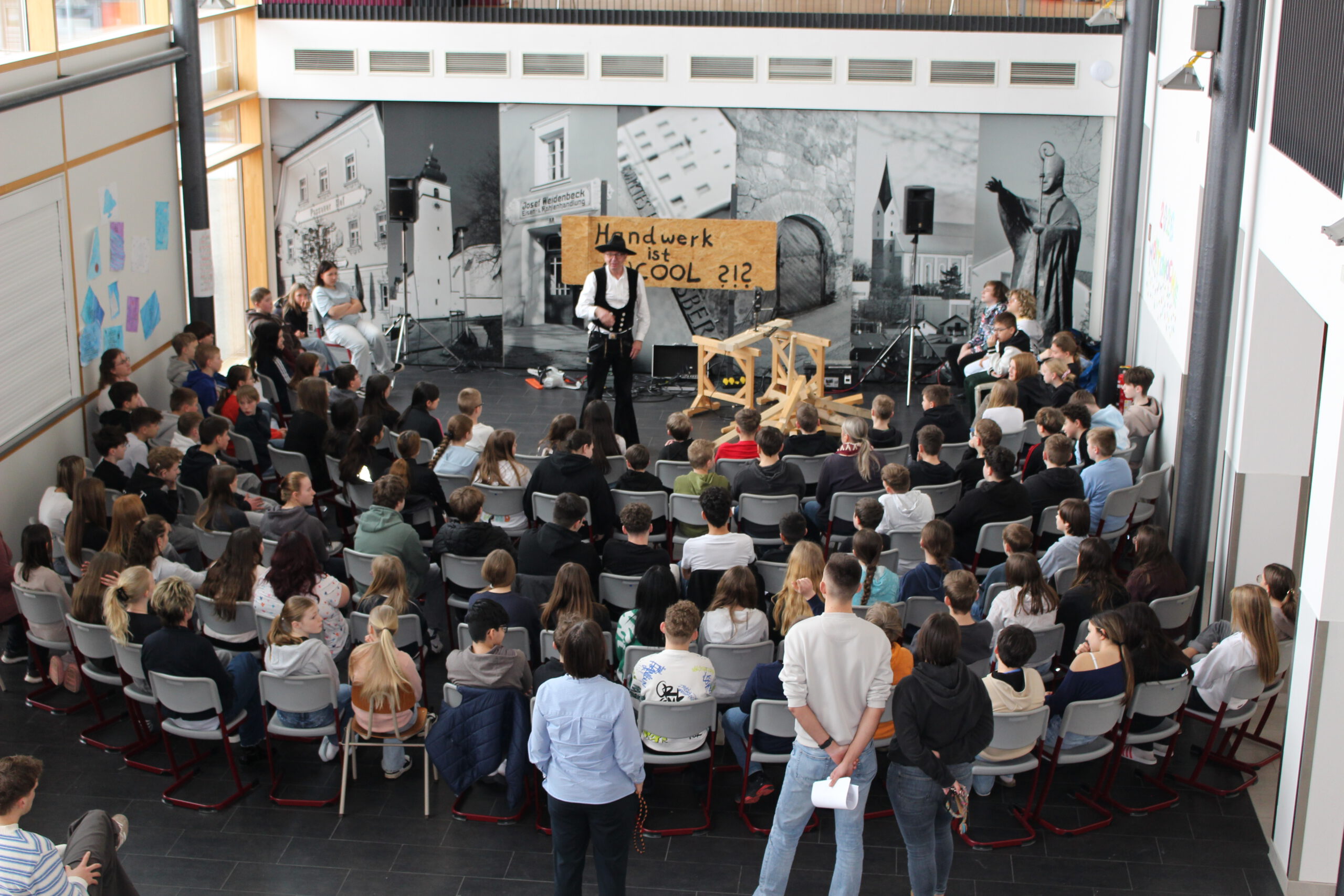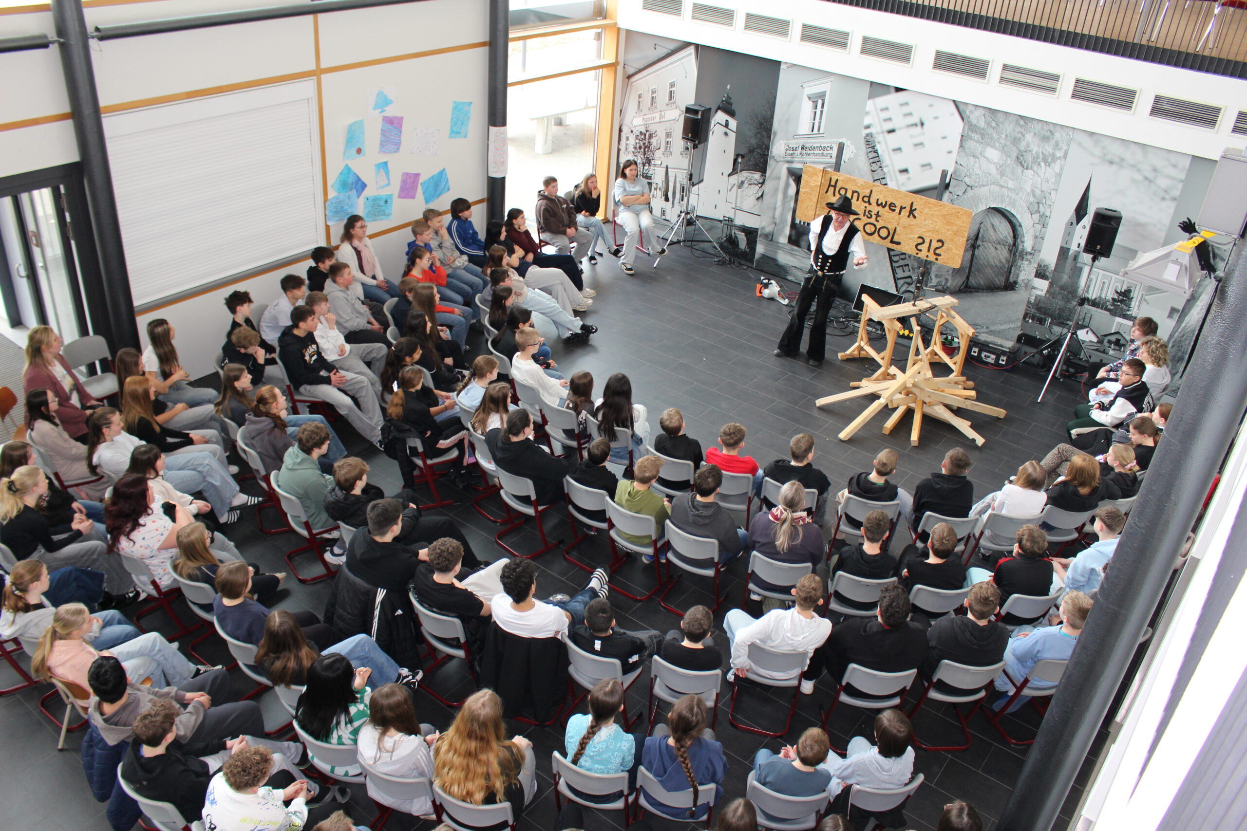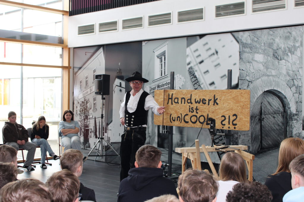 SchülerInnen der Klassen 6 und 7 erlebten an der Mittelschule Hengersberg das Theaterstück „Hand und Werk“ von Zimmermeister Richard Betz, mit dem er Jugendlichen an bayerischen Schulen seinen Beruf auf lebendige Art näherbringt. Der Zimmerer tourt seit 2016 für den Landesinnungsverband mit seinem Theaterstück durch die Lande.